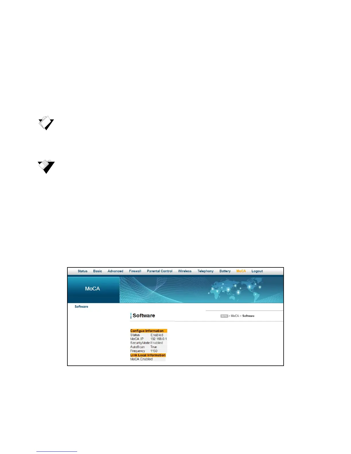 The MoCA menu of the Web user interface displays information about the MoCA status of