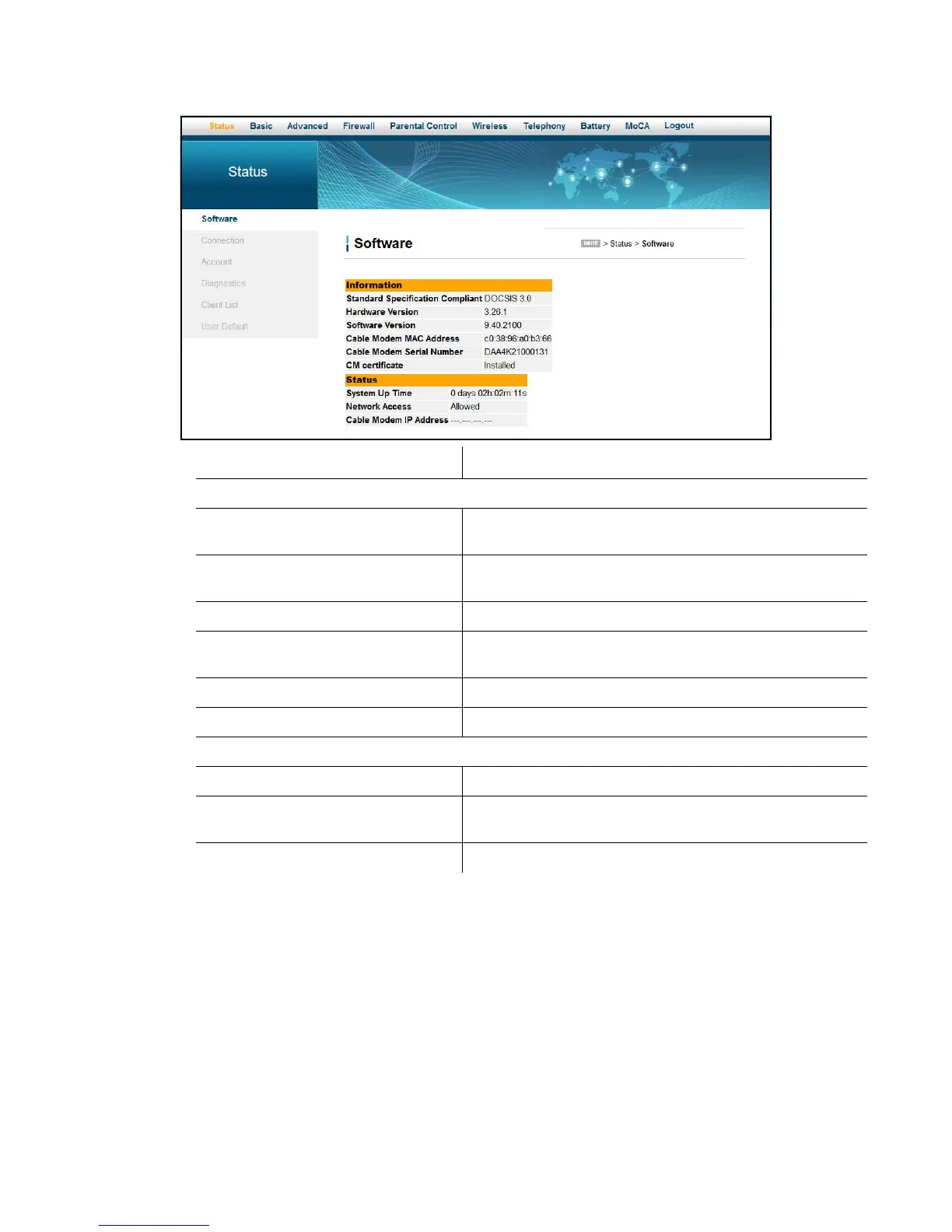 Cable Modem IP Address Displays the IP address for the cable modem.