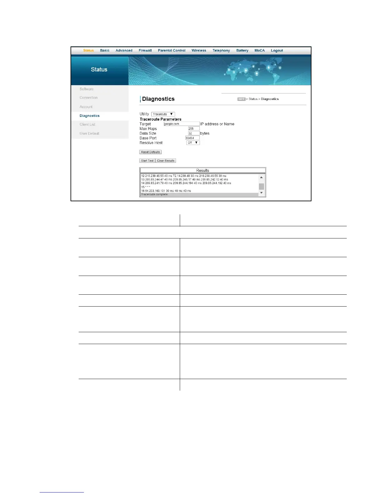 Reset Defaults Resets the Traceroute Parameters to the default values.