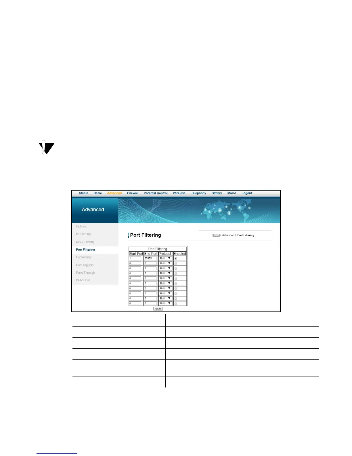 2. Click Port Filtering from the left side menu. Field descriptions are listed below the