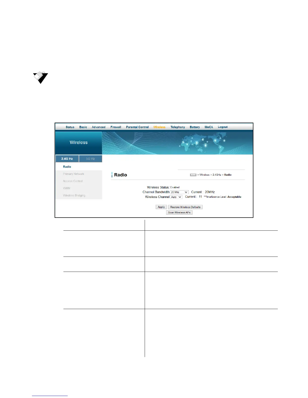 For the 2.4GHz radio, options are 20MHz (default value)