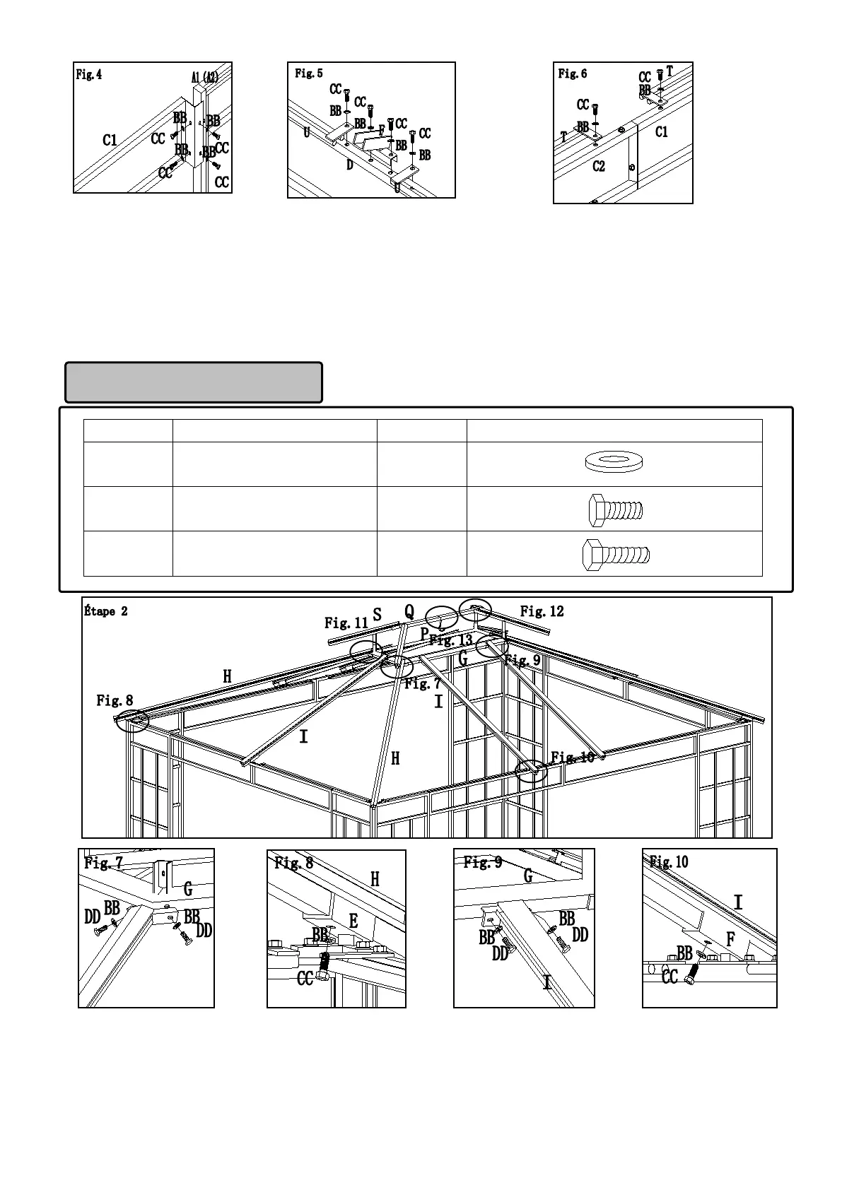 Fig.7 : Fixez le bord supérieur de la poutre oblique (H) au cadre supérieur (G) avec des boulons (CC) et des rondelles plates (BB).