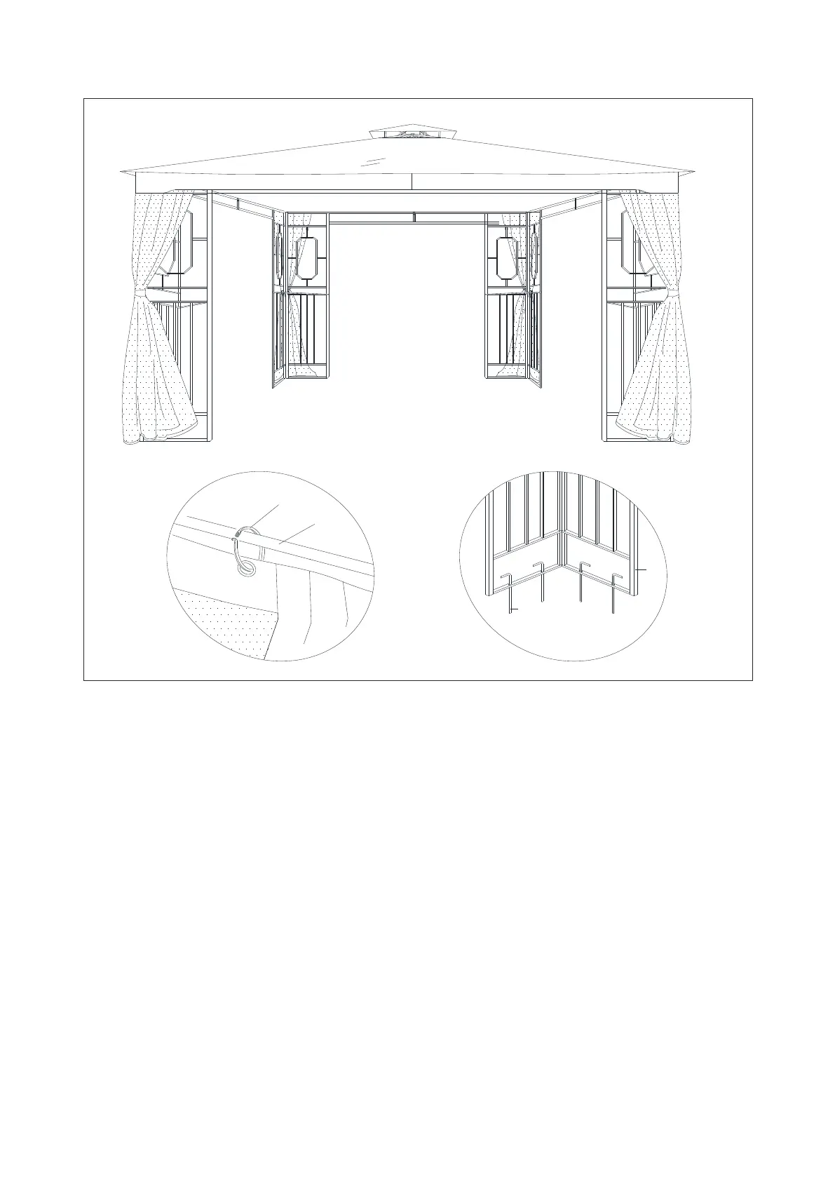 8. Accrocher le moustiquaire (J) sur les panneaux de coin (E) à l'aide