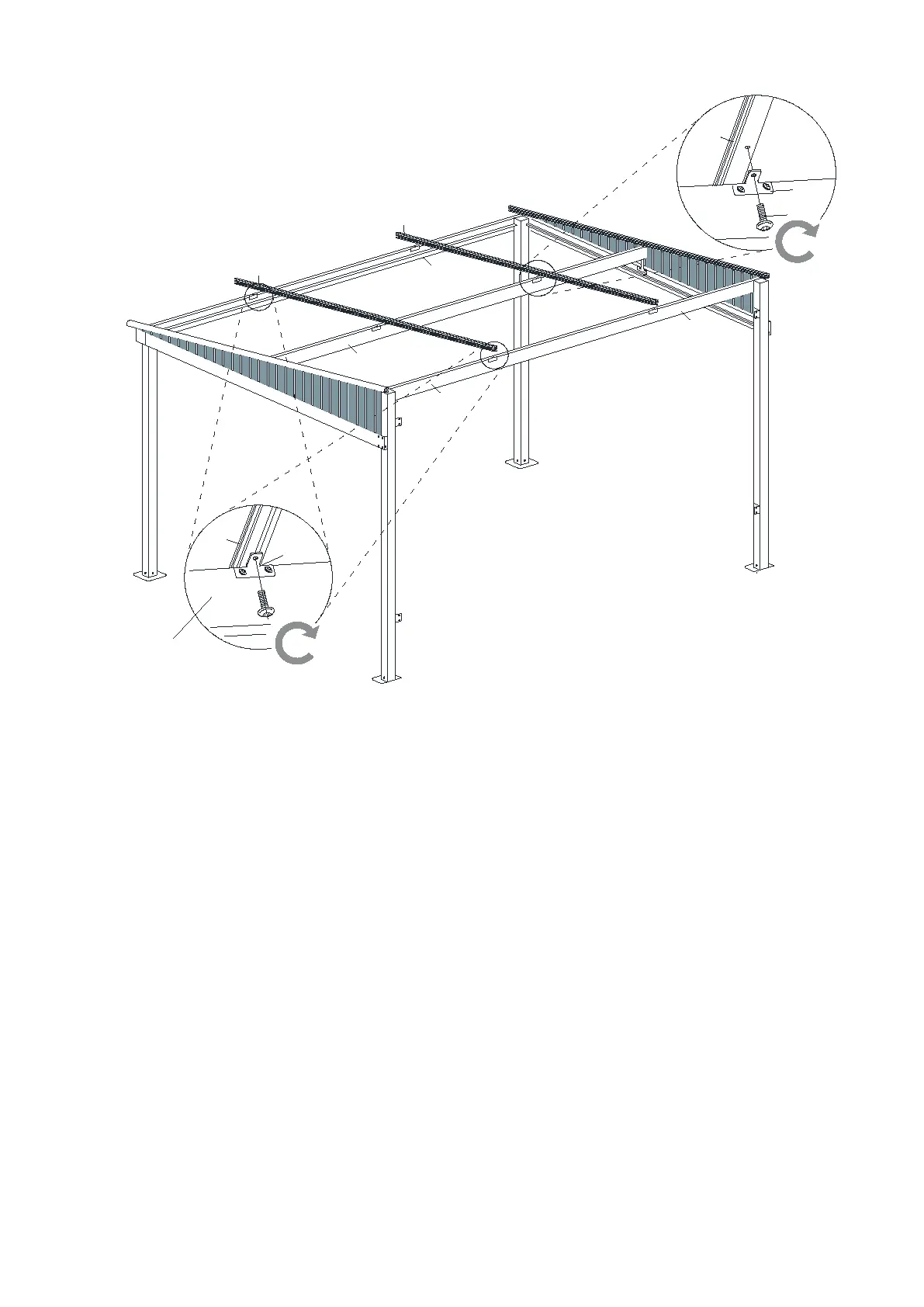 11.1. Attach the Roof Central Bars (J2) to the Lintels (G & G1) with Screws (V) in the holes of the