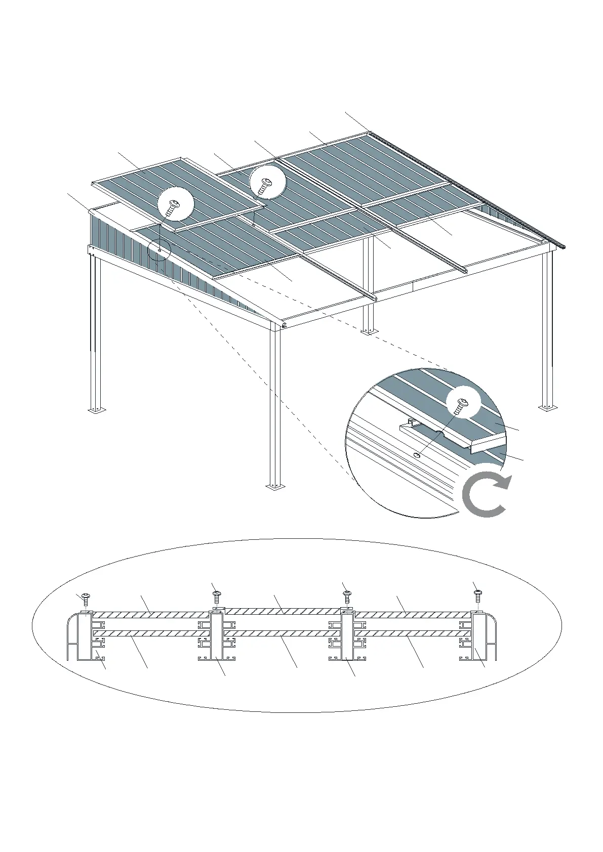 15. Fix the Main Roof Panels (K2) onto the Roof Corner BarJ/J1),Roof Central Bar(J2) with screw