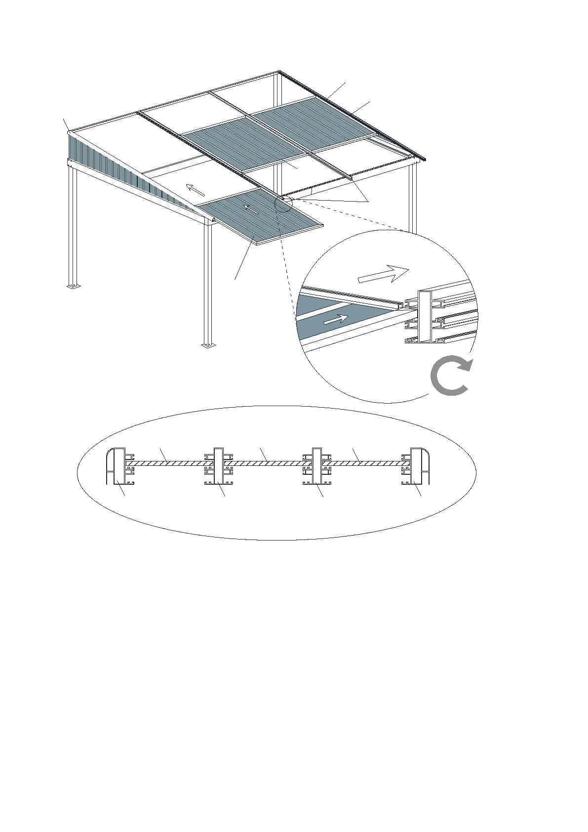 14.À partir de l'avant de l'abri, faites glisser dans la partie du haut des rails du toit trois panneaux de