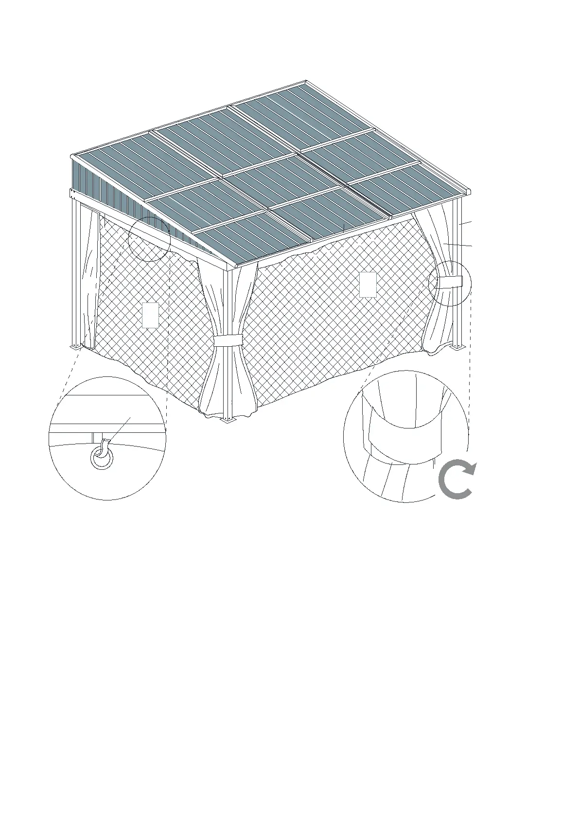 19.Installez le moustiquaire (S) sur les crochets du rail à l’intérieur de l’abri. Attachez le moustiquaire