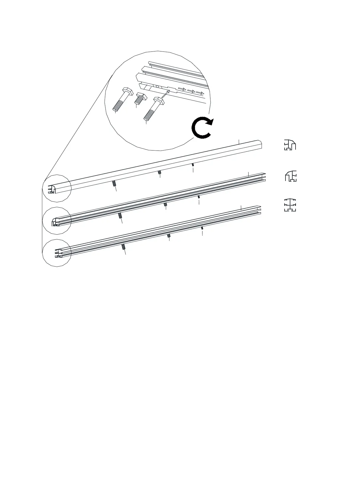 5. Insert the Screws (W1), (W2), (W1) into the grooves of each Roof Corner Bar (J & J1) and each
