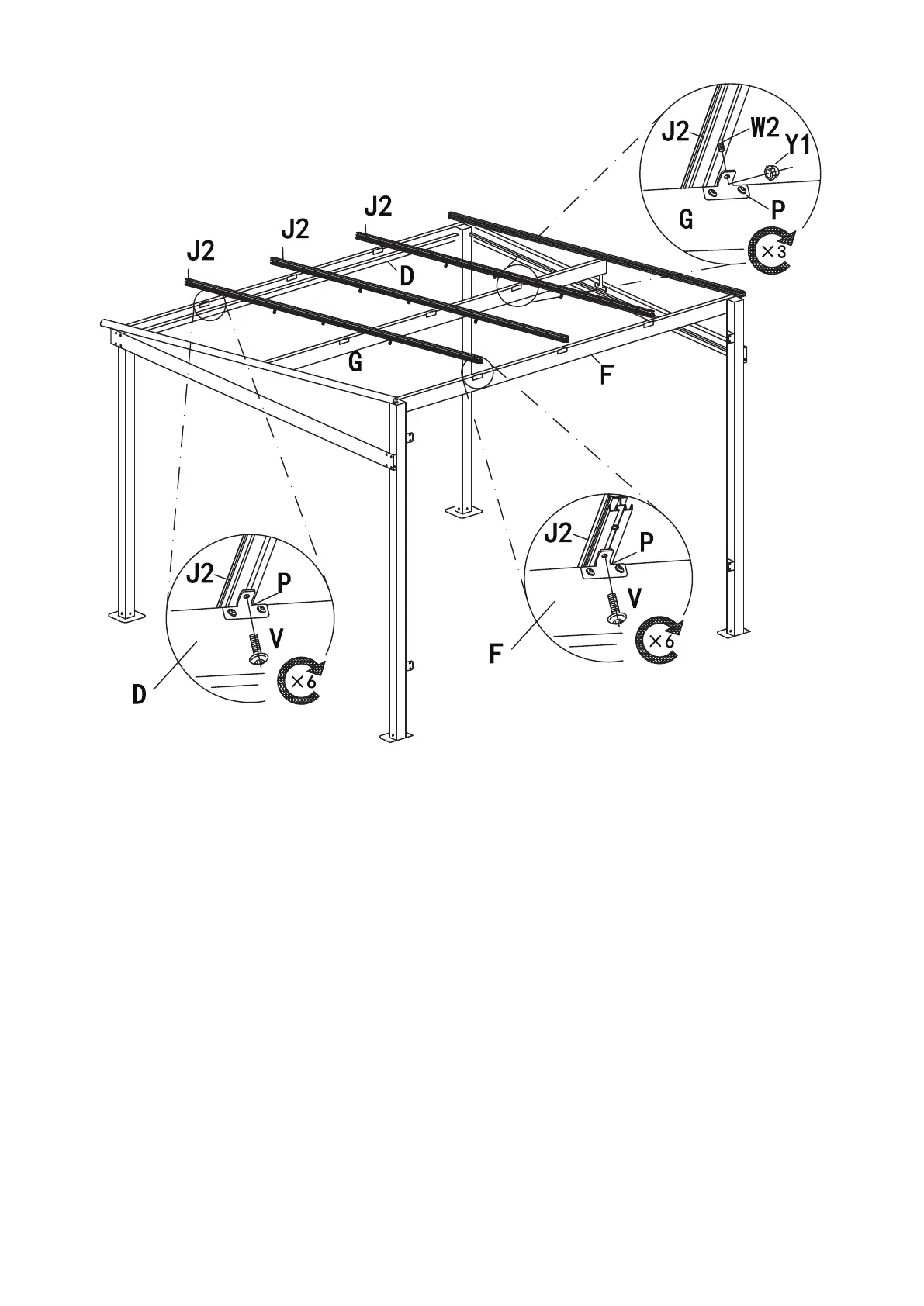 10.2. Attach the end of the Roof Central Bars (J2) to the Bars (D & F) with Screws (V) in the holes of the