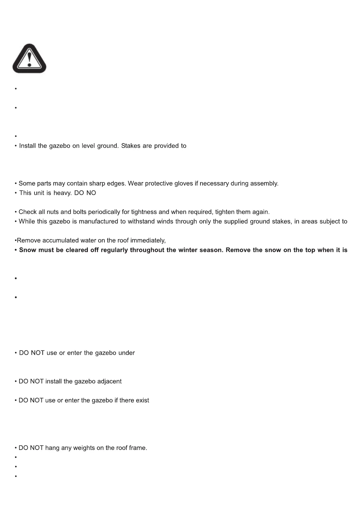 to trees or a sloped roof. Snow and ice may slide onto the gazebo and cause it