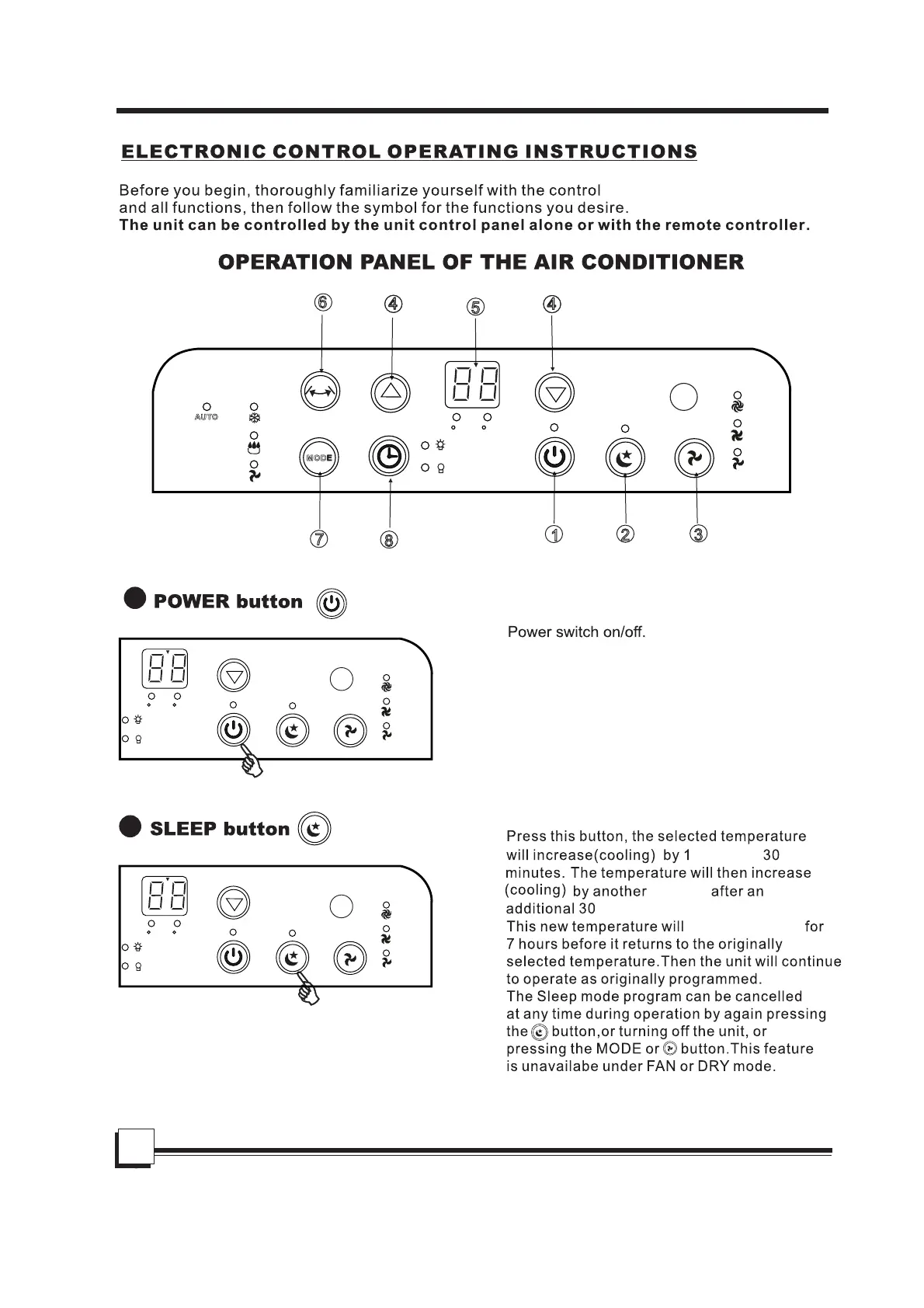 Uberhaus 87795002 - Air Conditioner Features; Electronic Control Operating Instructions; Operation Panel Overview