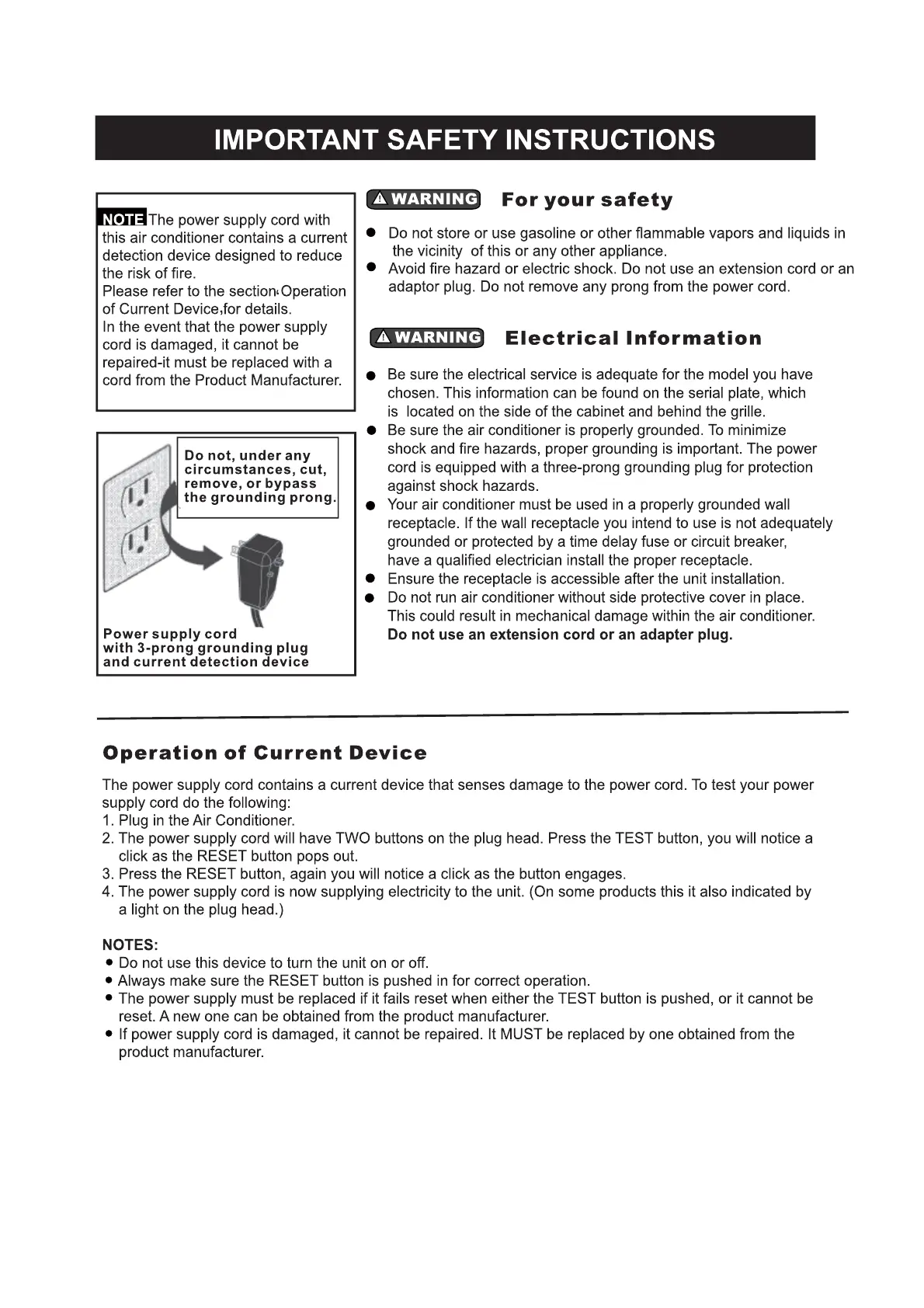 Uberhaus 87795008 - IMPORTANT SAFETY INSTRUCTIONS; Electrical Information; Operation of Current Device