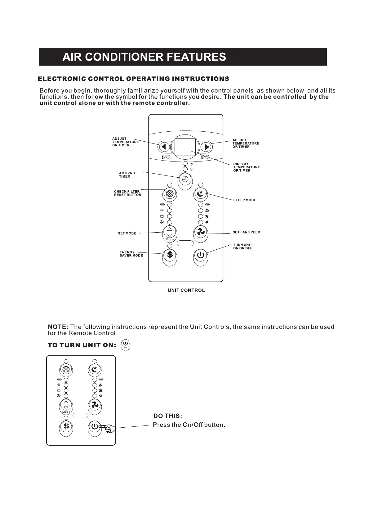 Uberhaus 87795008 - AIR CONDITIONER FEATURES; Unit Control Panel Overview