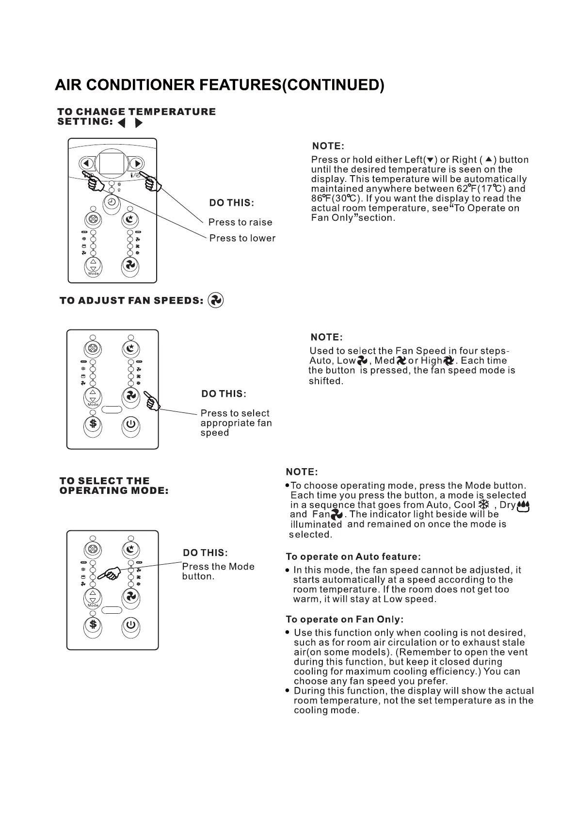 Uberhaus 87795009 - To Change Temperature Setting; To Adjust Fan Speeds; To Select the Operating Mode; To Operate on Fan Only