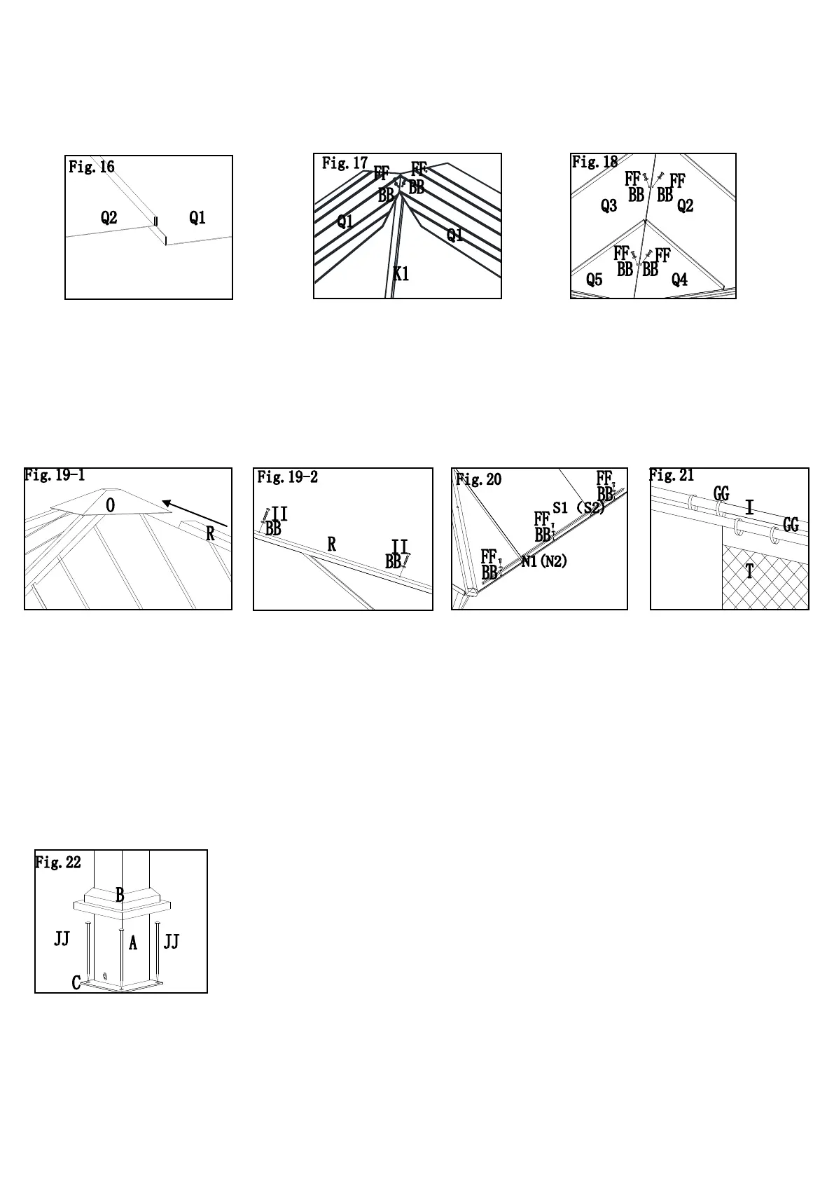 Fig. 18 : Fixez les panneaux de toit 2/3/4/5 (Q2/Q3/Q4/Q5) à la poutre inclinée (K1) avec des vis (FF) et des rondelles.