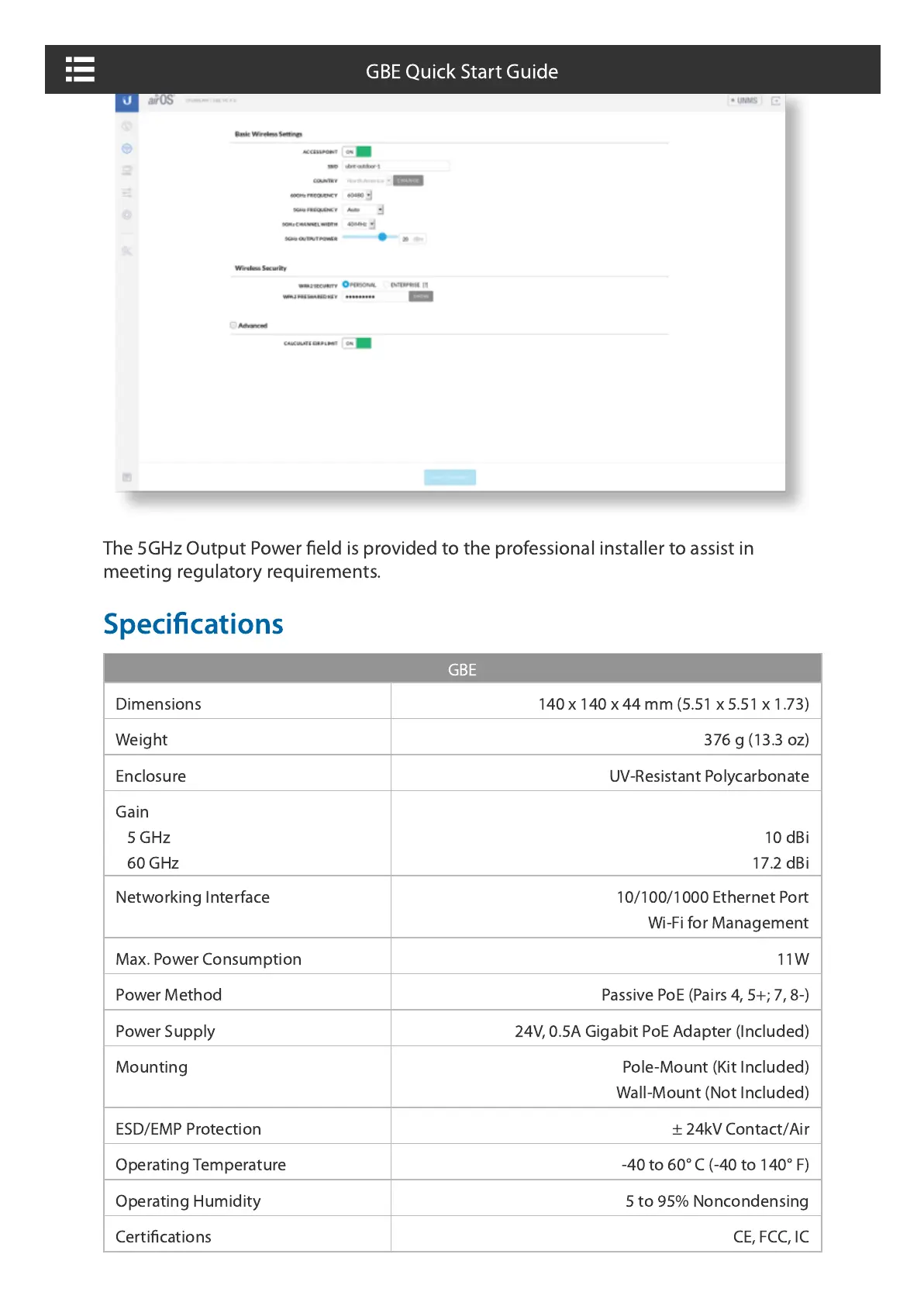 The 5GHz Output Power field is provided to the professional installer to assist in