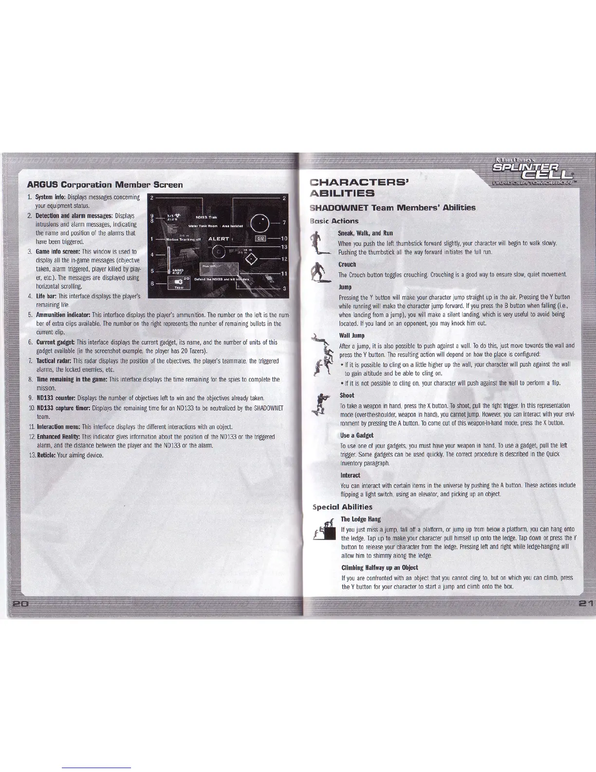 ubisoft SPLINTER CELL-PANDORA TOMORROW - SHADOWNET Character Abilities; Basic Actions and Movement; Advanced SHADOWNET Maneuvers