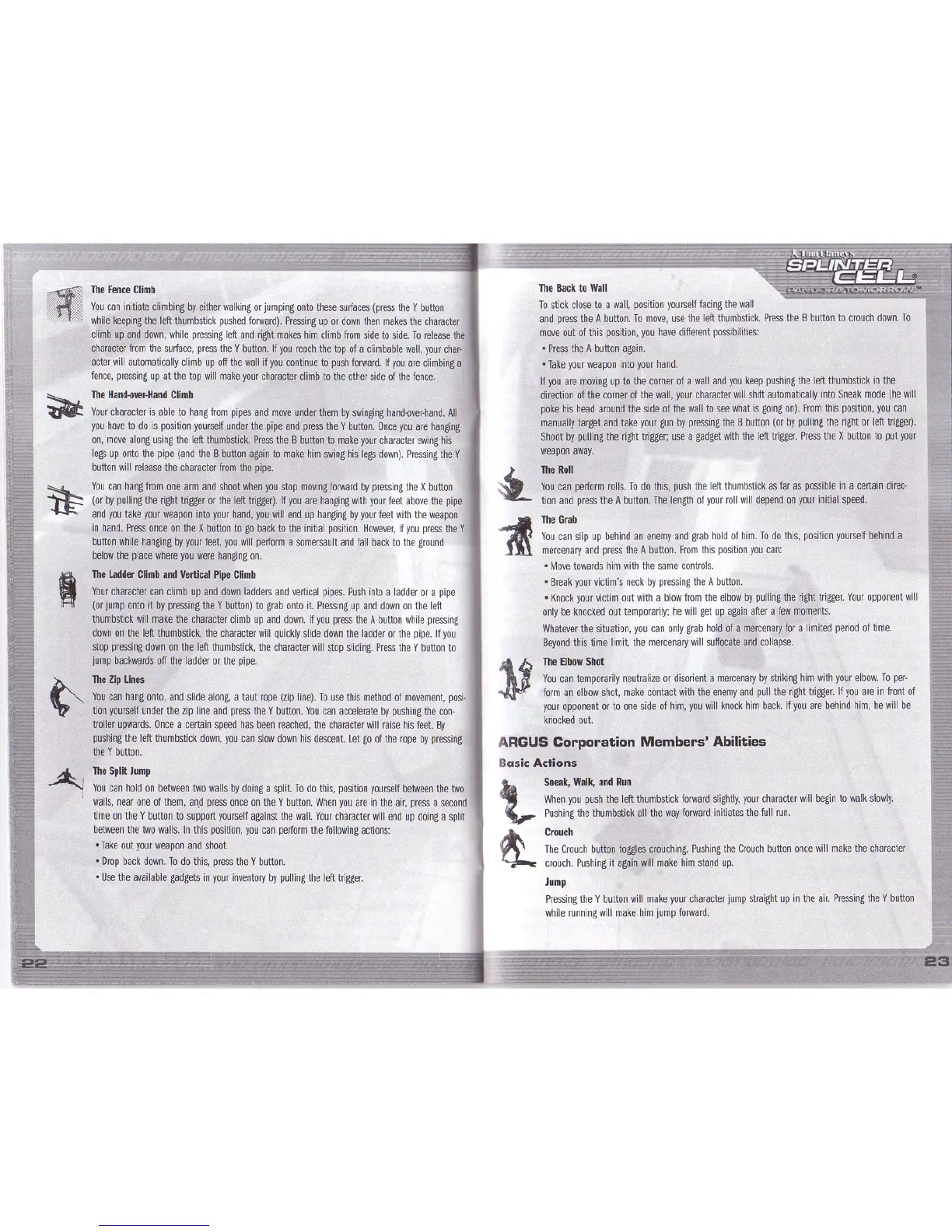 ubisoft SPLINTER CELL-PANDORA TOMORROW - Environmental Traversal Techniques; Climbing and Wall Interaction; ARGUS Character Abilities; Basic ARGUS Actions