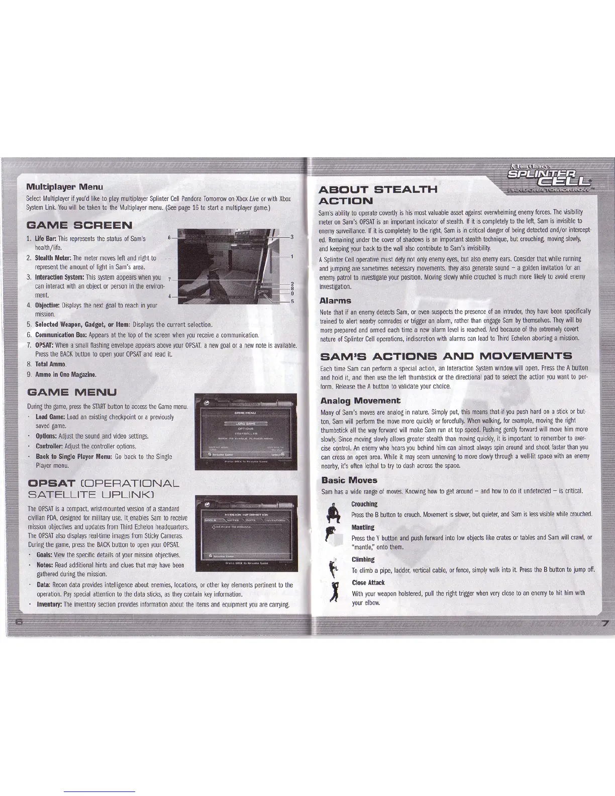 ubisoft SPLINTER CELL-PANDORA TOMORROW - Game Screen Interface Elements; Health, Stealth, and Mission Indicators; Game Menu and Stealth Mechanics; Menu Options and Settings