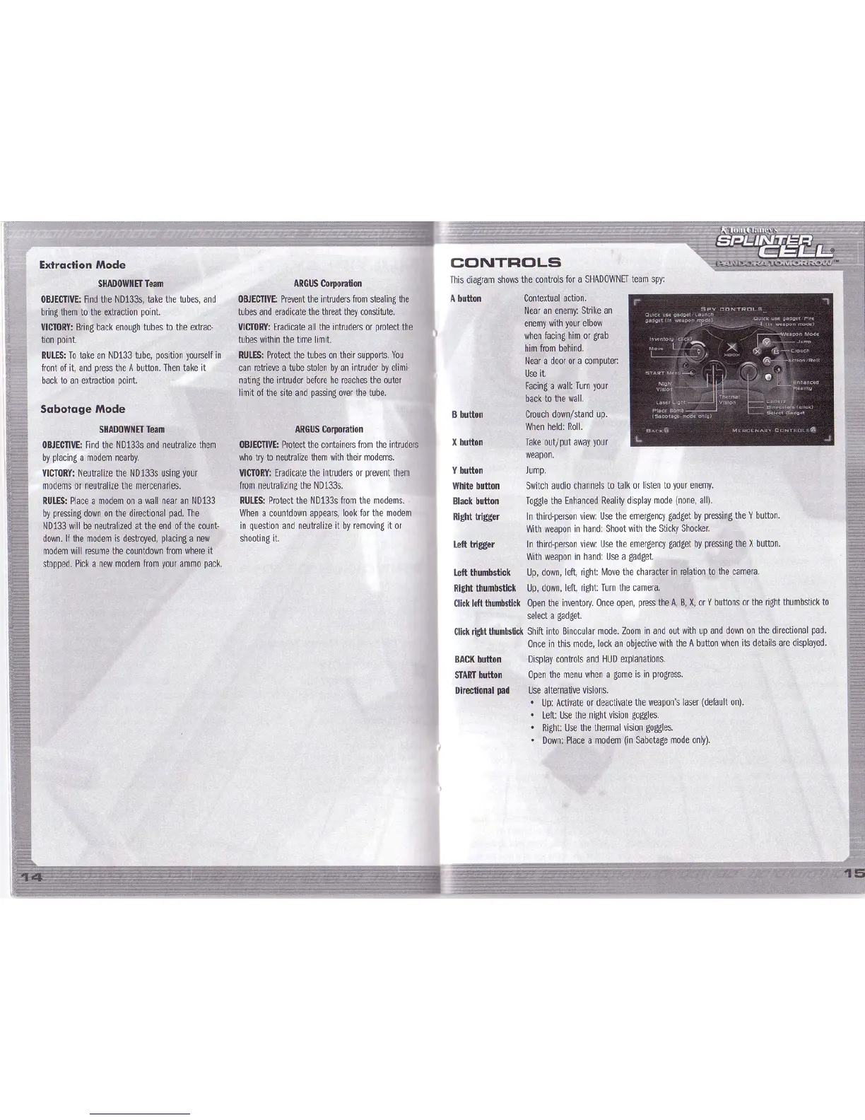 ubisoft SPLINTER CELL-PANDORA TOMORROW - Multiplayer Game Modes Details; Extraction and Sabotage Mode Rules; Controller Mappings and Functions; Spy and Mercenary Control Schemes