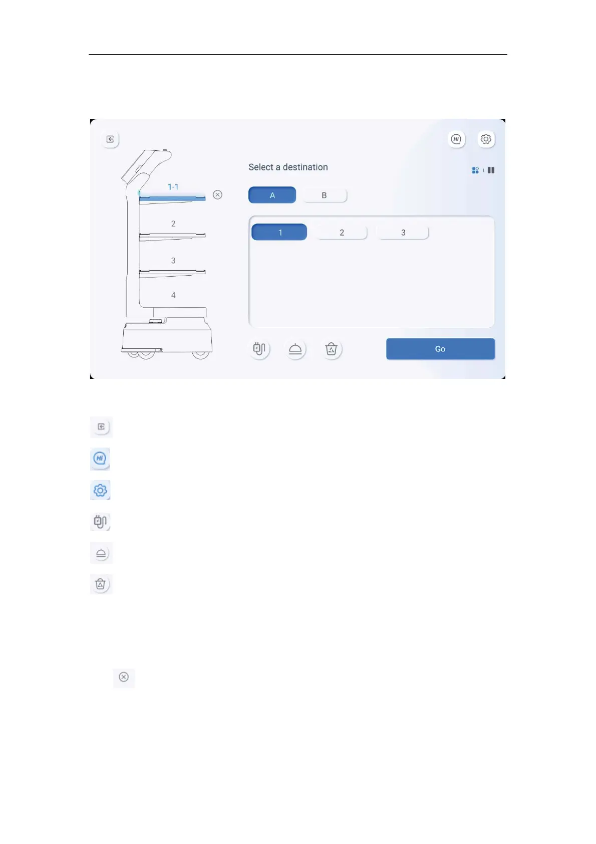 need to manually select the tray and destination (e.g. table number), and can choose the