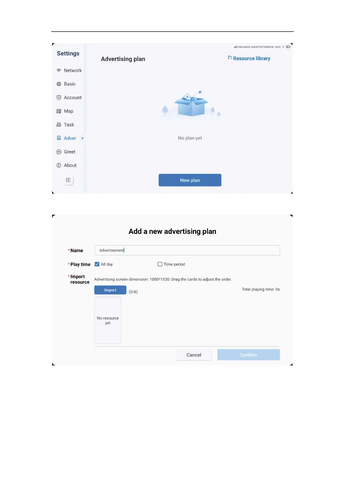 1. Click "Add plan" to edit the plan name and select the playing time period. You can