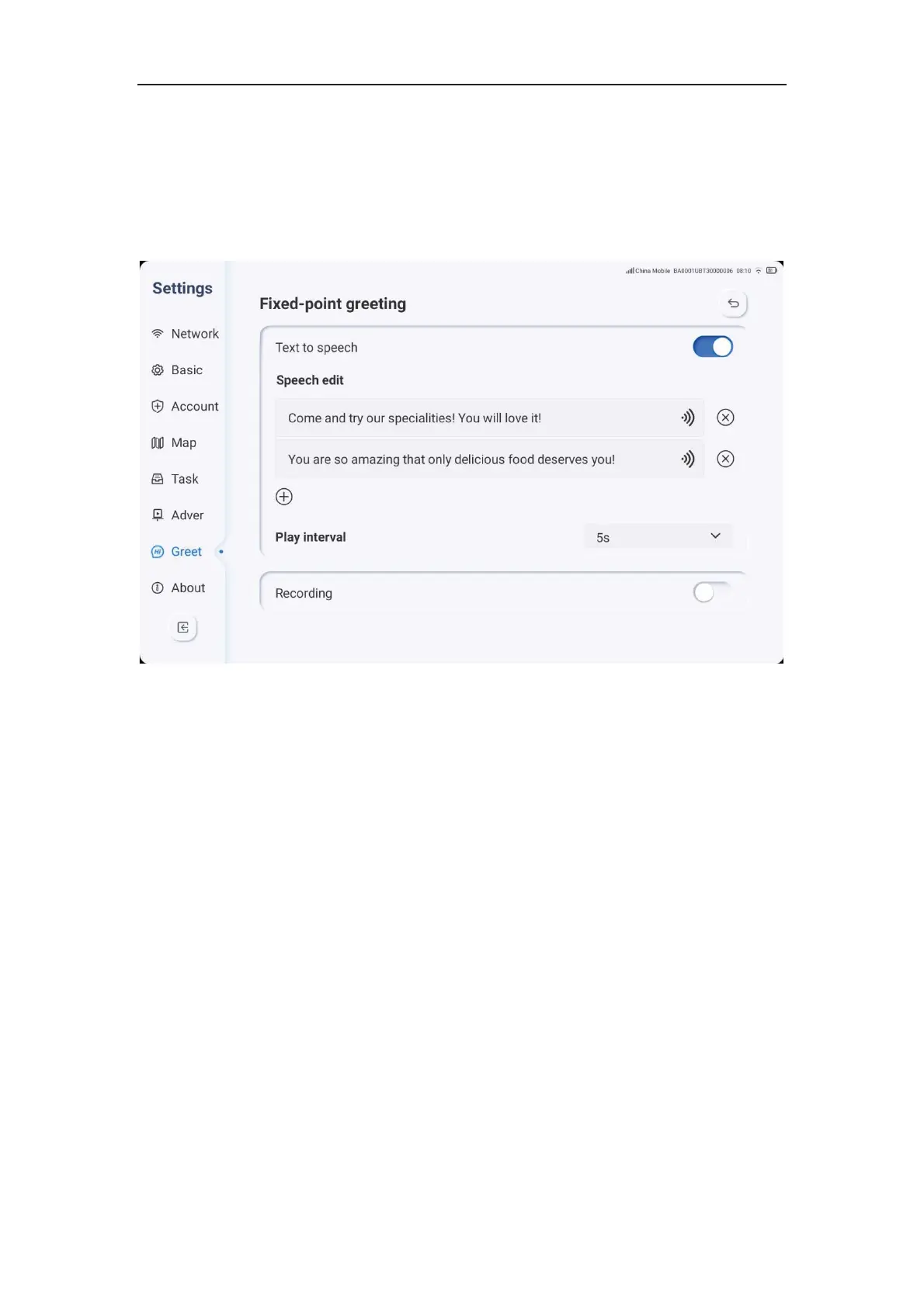 4. The speech setting has two default phrases for text-to-speech and five maximum