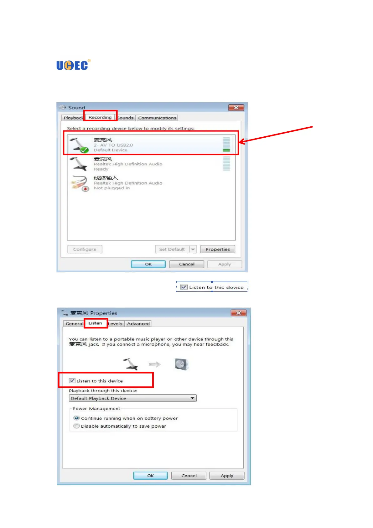 Click 2-AV TO USB2.0. Click “Listen” ClickApply, Sound