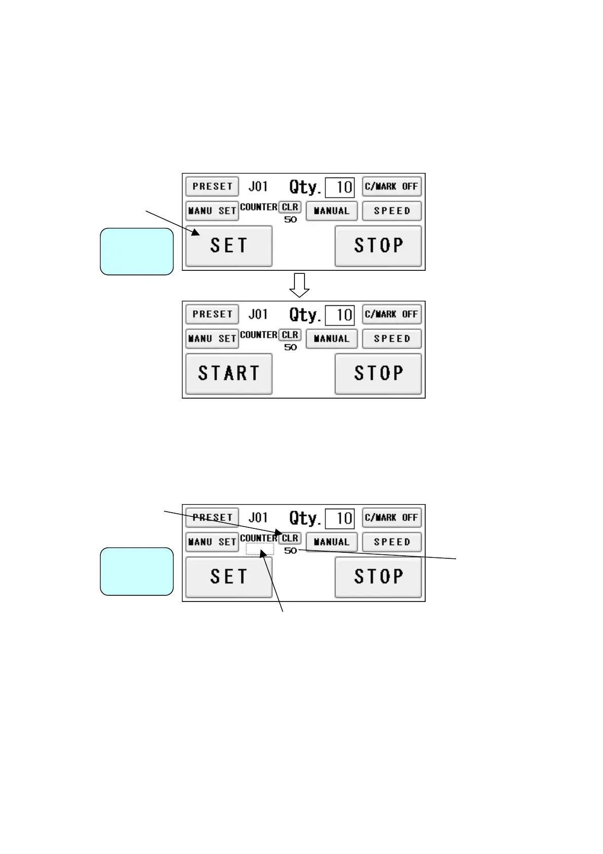 ① By pressing SET, the feed table will be lowered to the bottom dead point and the slitter will