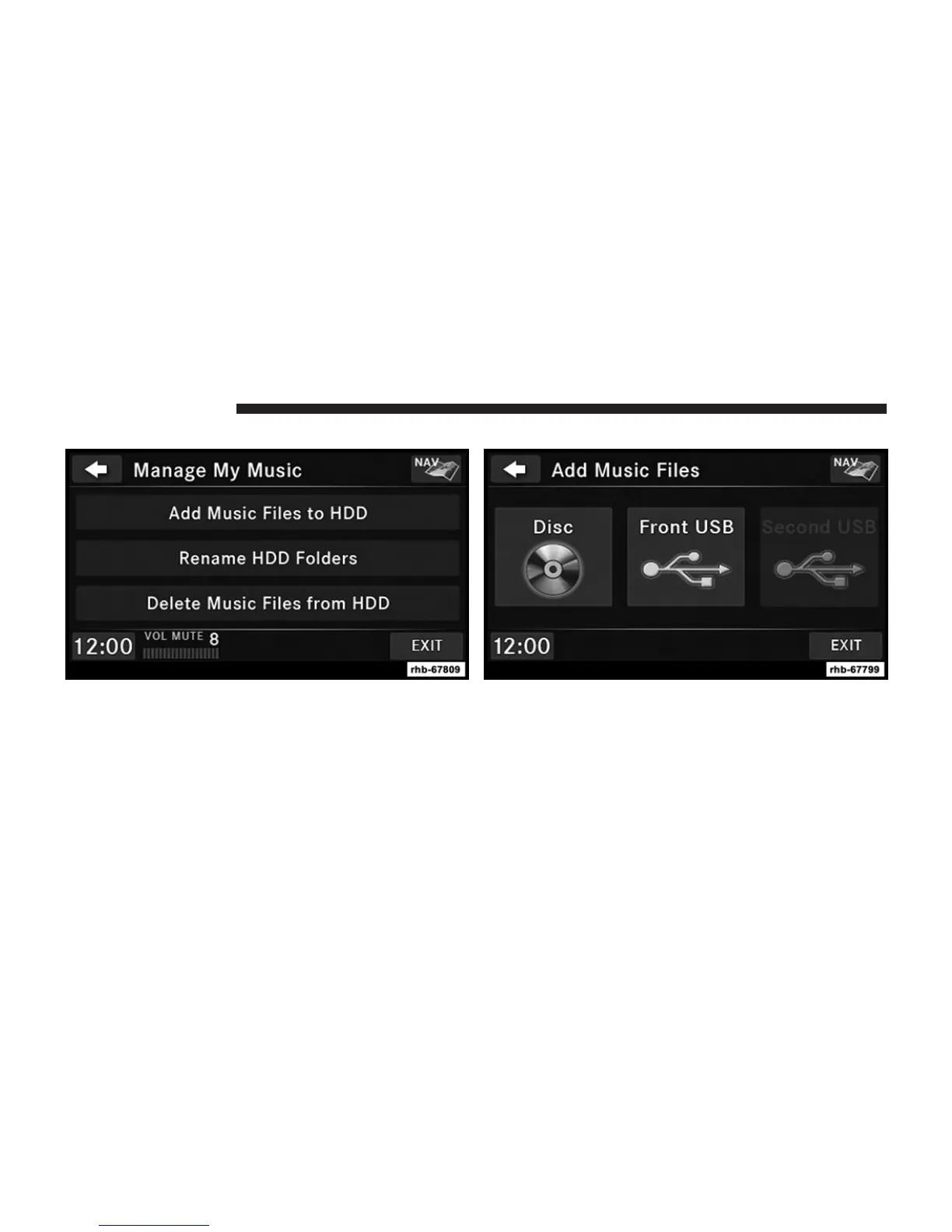 2. Select My Music. 3. Touch the Add Music Files to HDD soft-key.