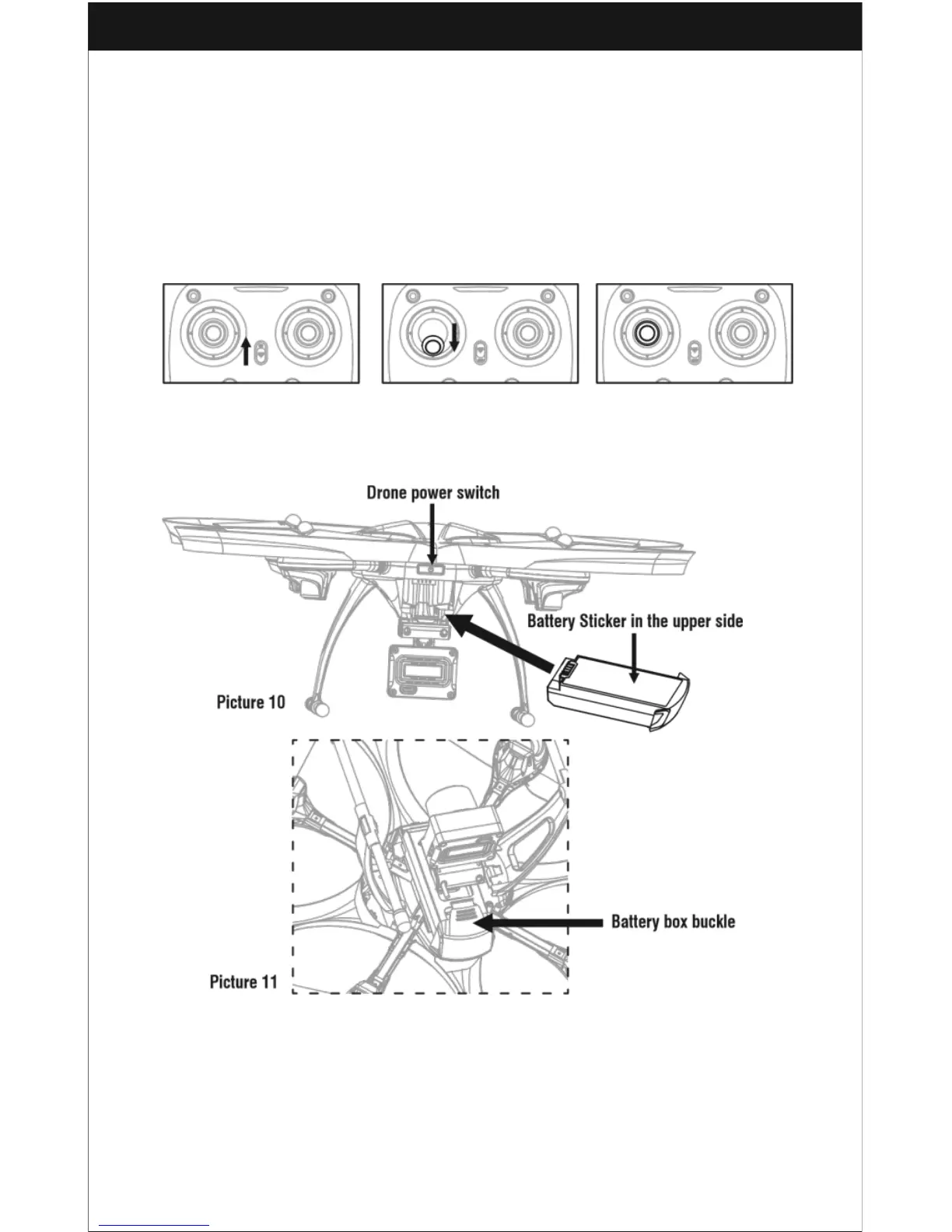 2. Install the LiPo battery into the drone as shown (Picture 10). You will need to press