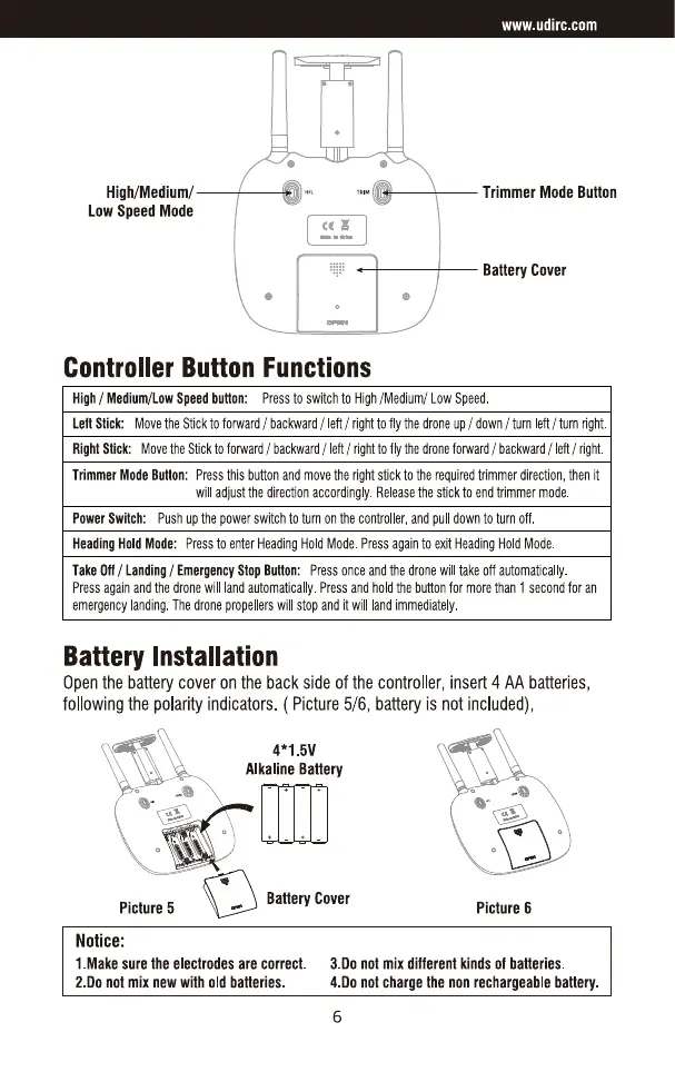 udir/c Wings U29S - Controller Operation and Power; Controller Button Functions; Controller Battery Installation