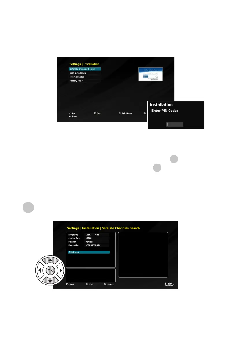 To conduct a Satellite Channel Search, enter the INSTALLATION menu, and select
