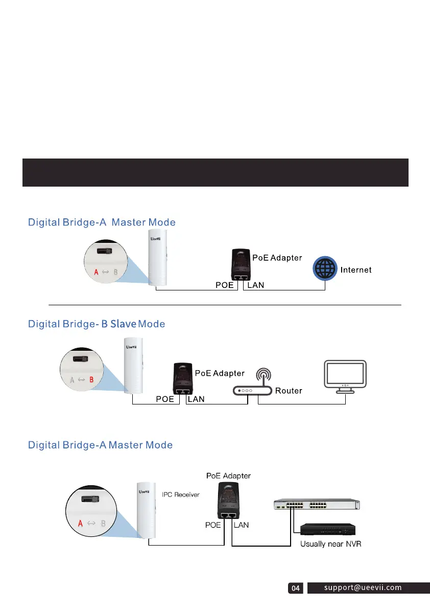 mended within 20 meters, must Cat 5e or up) to connect the wireless bridge and