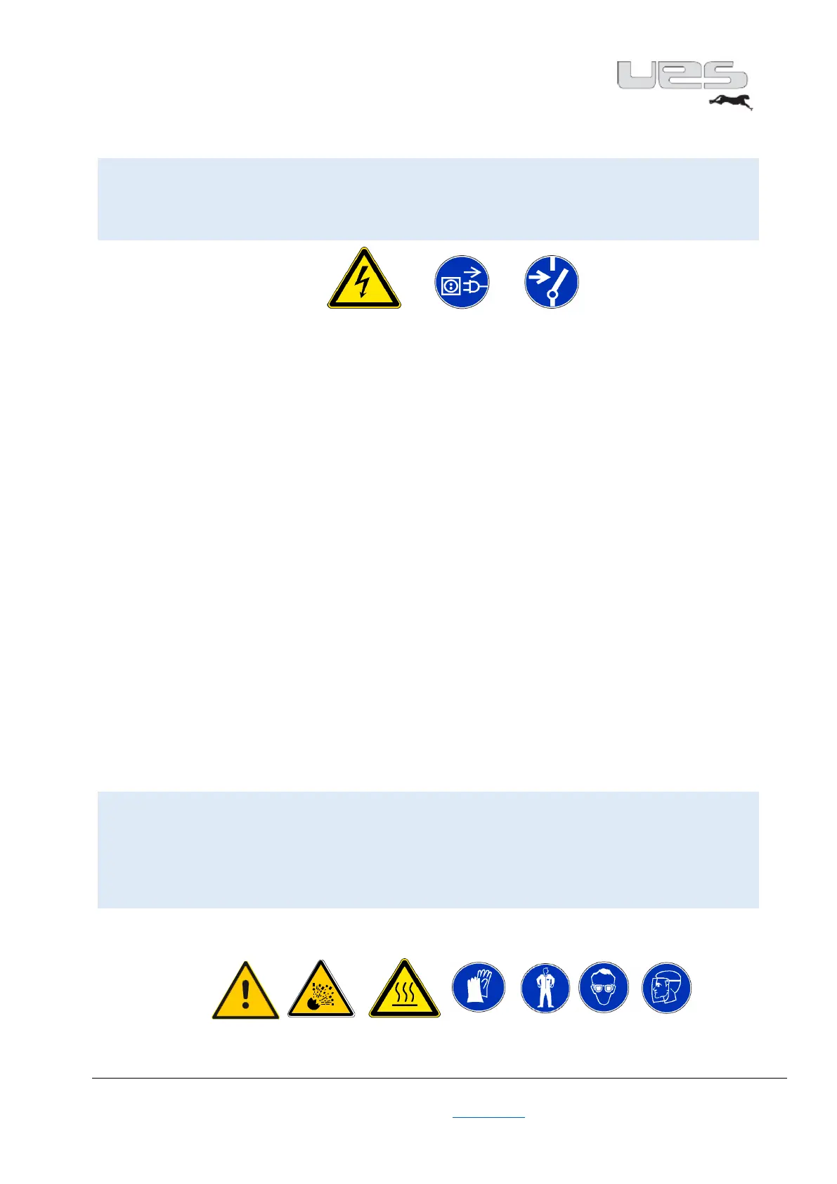 • Always wear safety glasses, protective gloves and protective clothing that covers those parts of the