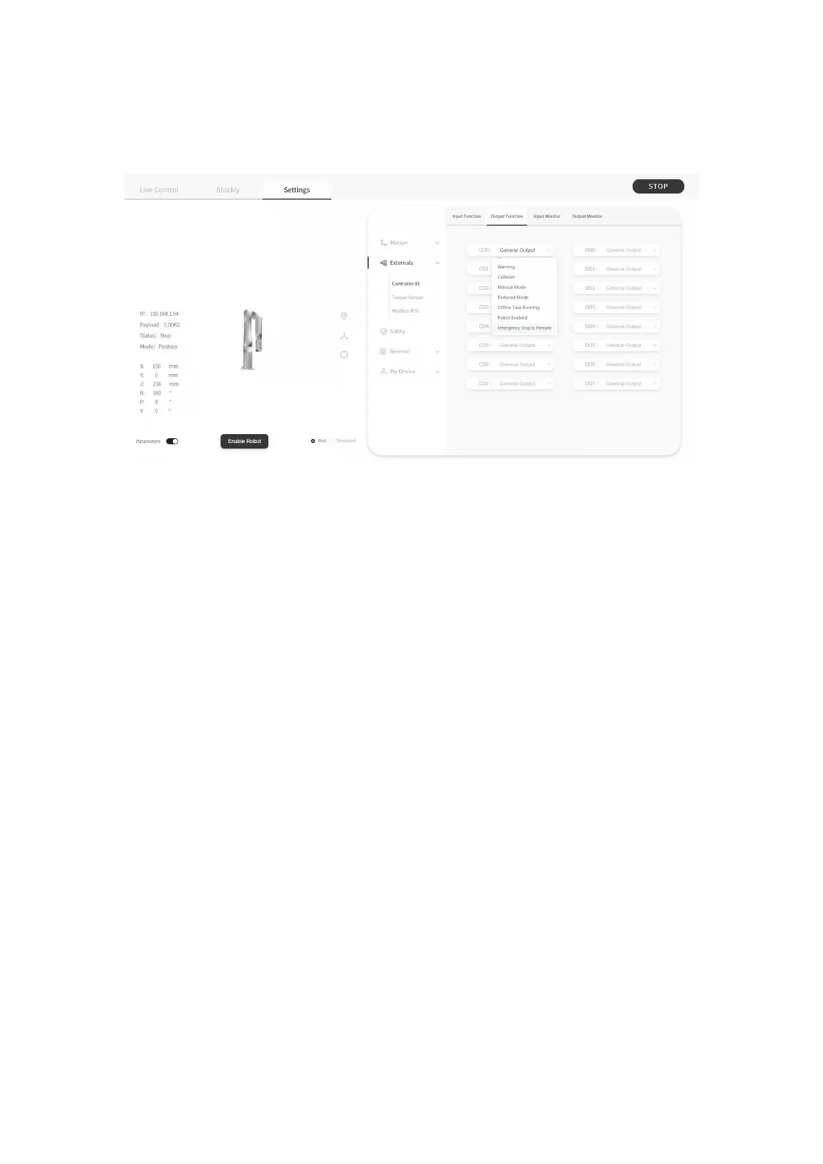 When the Emergency Stop button of the control box is pressed,