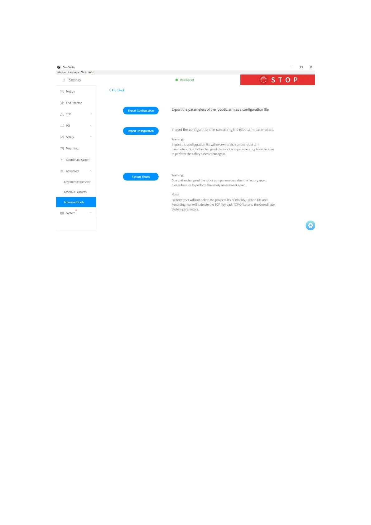 3. Click the Factory Reset button, and the robotic arm will restore the factory