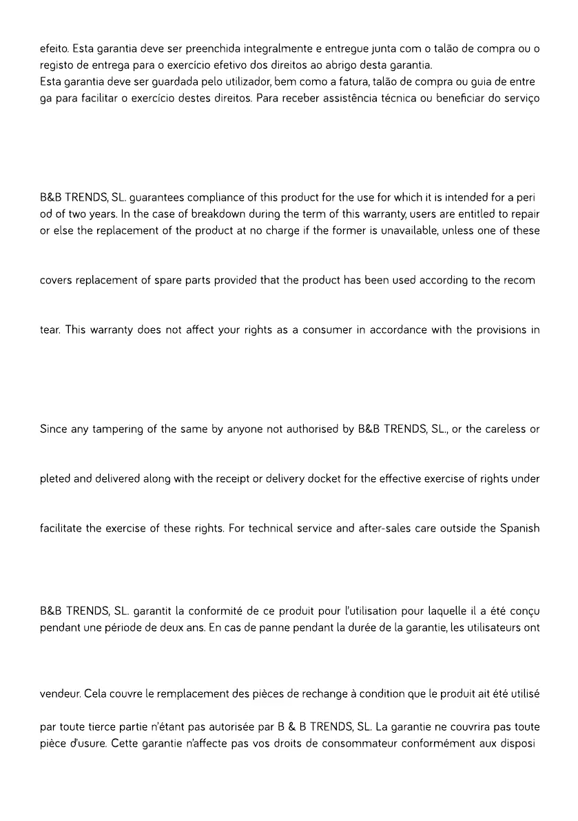 that is not authorised by B & B TRENDS, SL. The warranty will not cover any parts subject to wear and