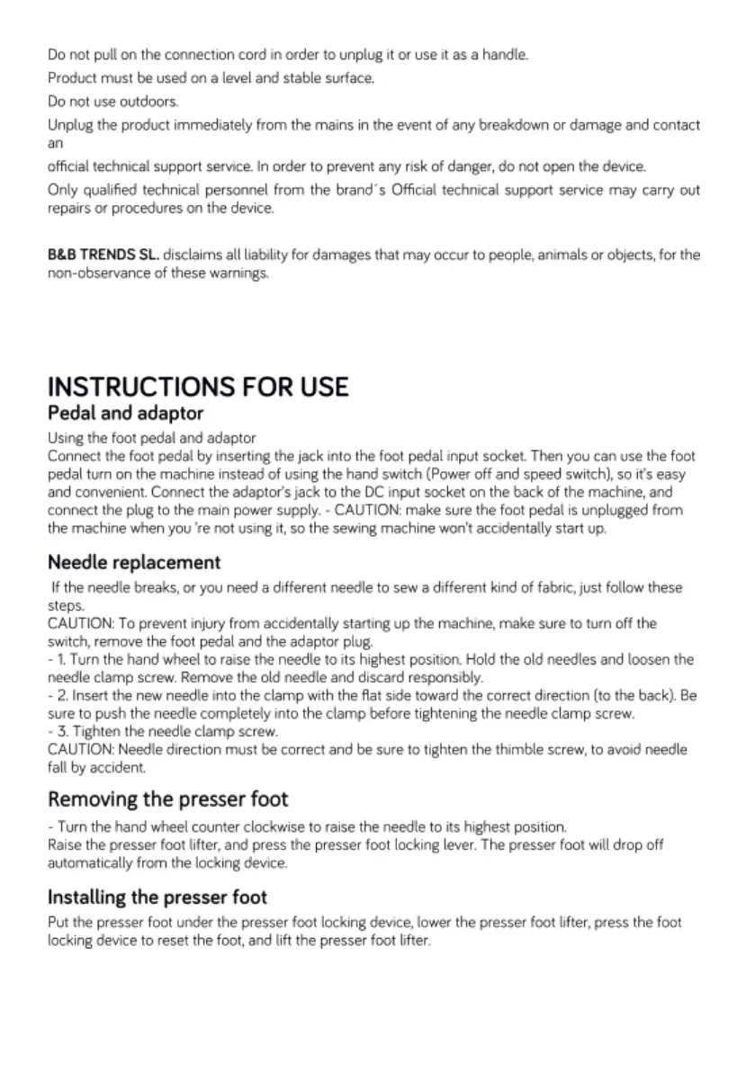 UFESA SW3003 Performance - Operating Instructions; Using the Foot Pedal and Adapter; Replacing the Needle; Presser Foot Handling