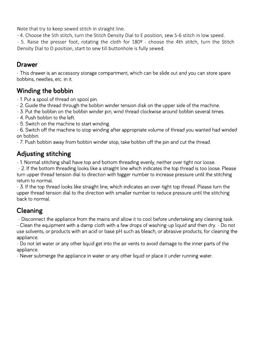 UFESA SW3003 Performance - Accessory Drawer Storage; Bobbin Winding Procedure; Stitch Adjustment Guide; Machine Cleaning Instructions
