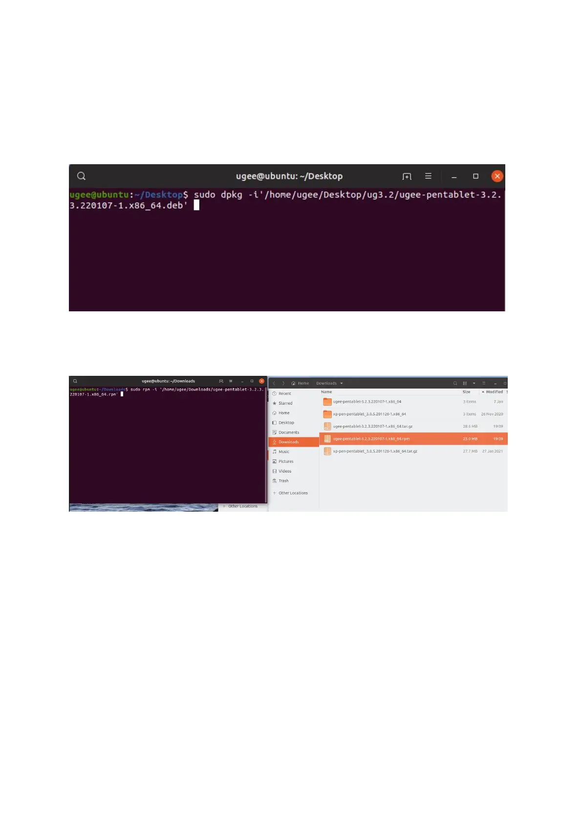 Deb: Enter command "sudo dpkg -i". Drag installation file to window and execute