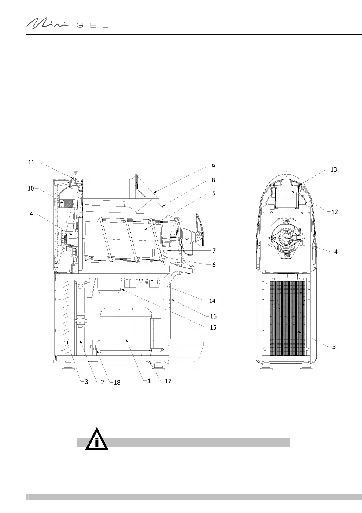 mezclador (7) y el cilindro evaporador (5), es decir, el órgano destinado a enfriar el producto. Además en la parte posterior, se