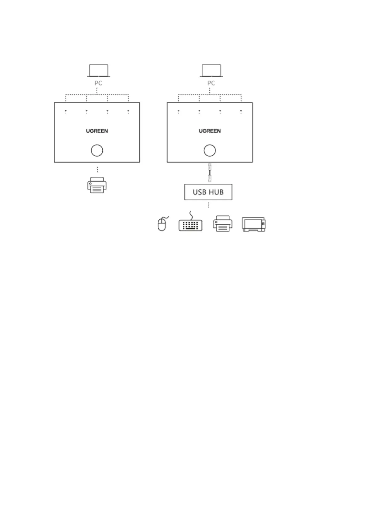 1. Csatlakoztassa négy vagy két számítógépét egymás után a megosztókapcsoló