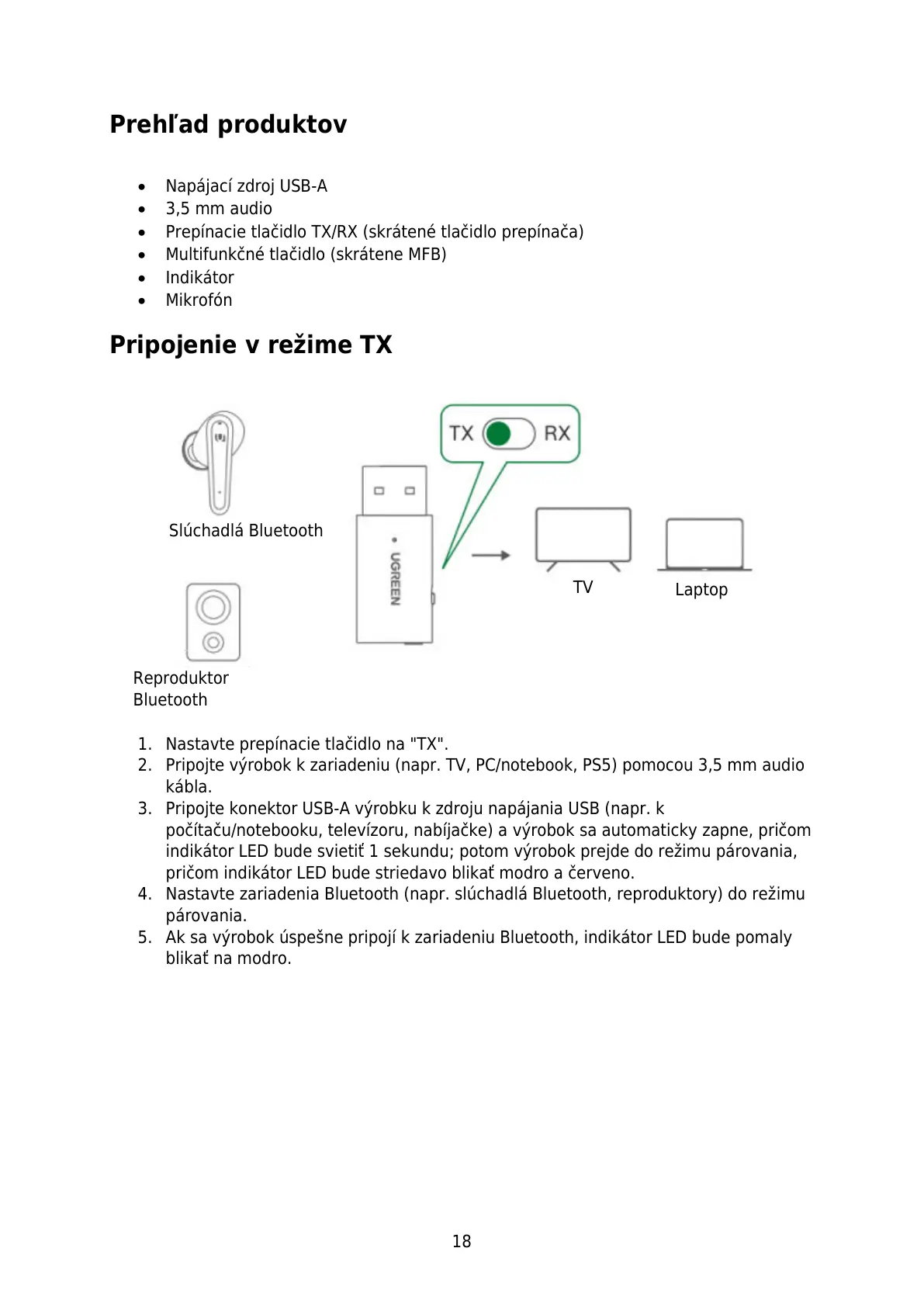 indikátor LED bude svietiť 1 sekundu; potom výrobok prejde do režimu párovania,