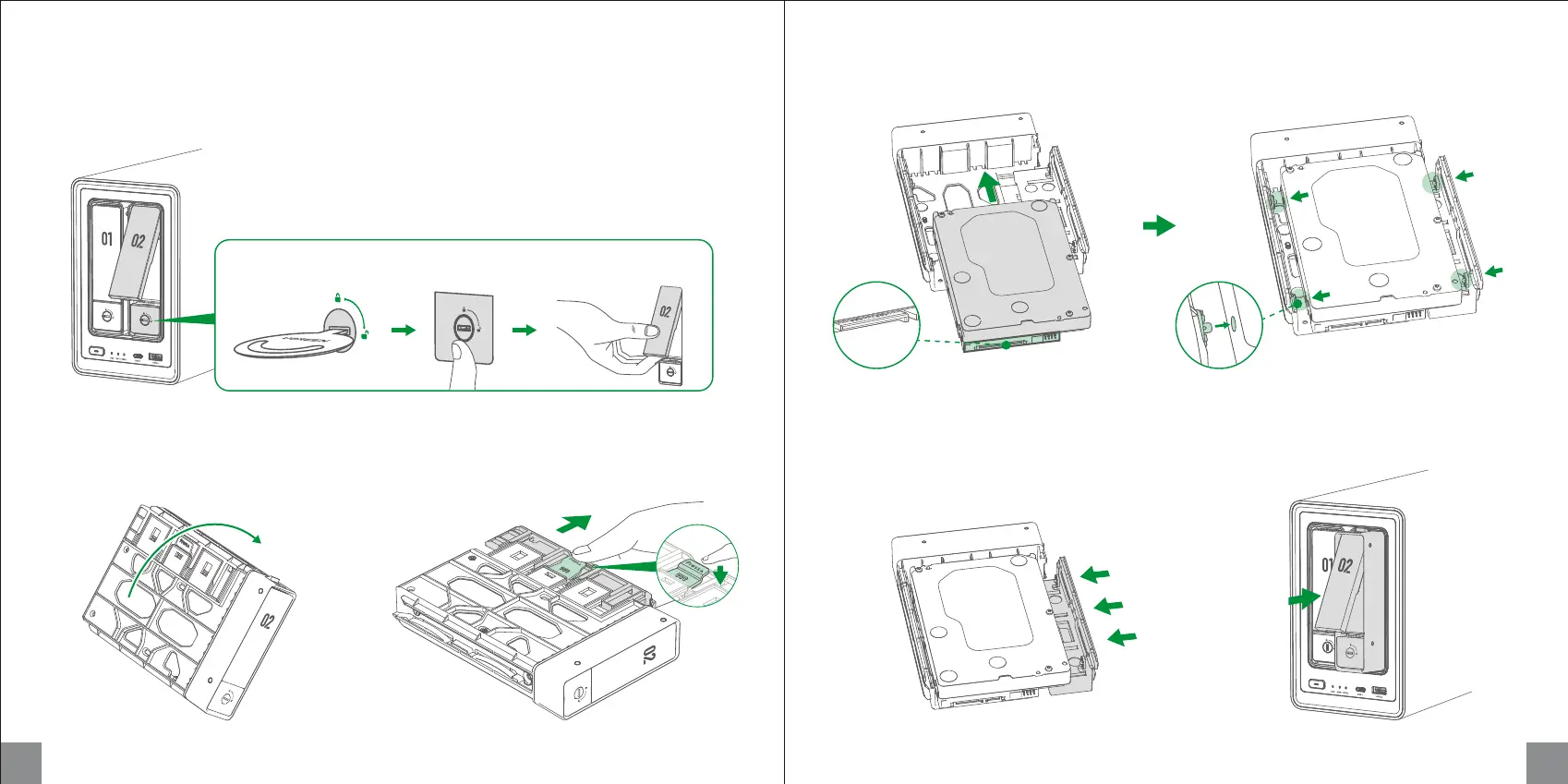 Use the key to unlock the hard drive tray, press the buckle to pop the handle out, then pull the tray out.