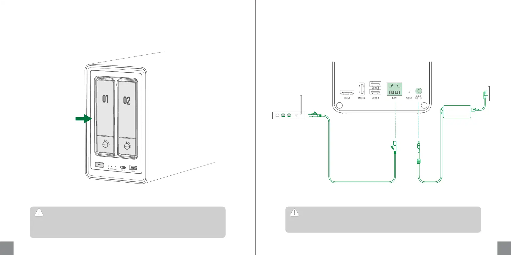 Use Ethernet cable to connect NAS to a LAN port on a router. Connect the power adapter to the device,