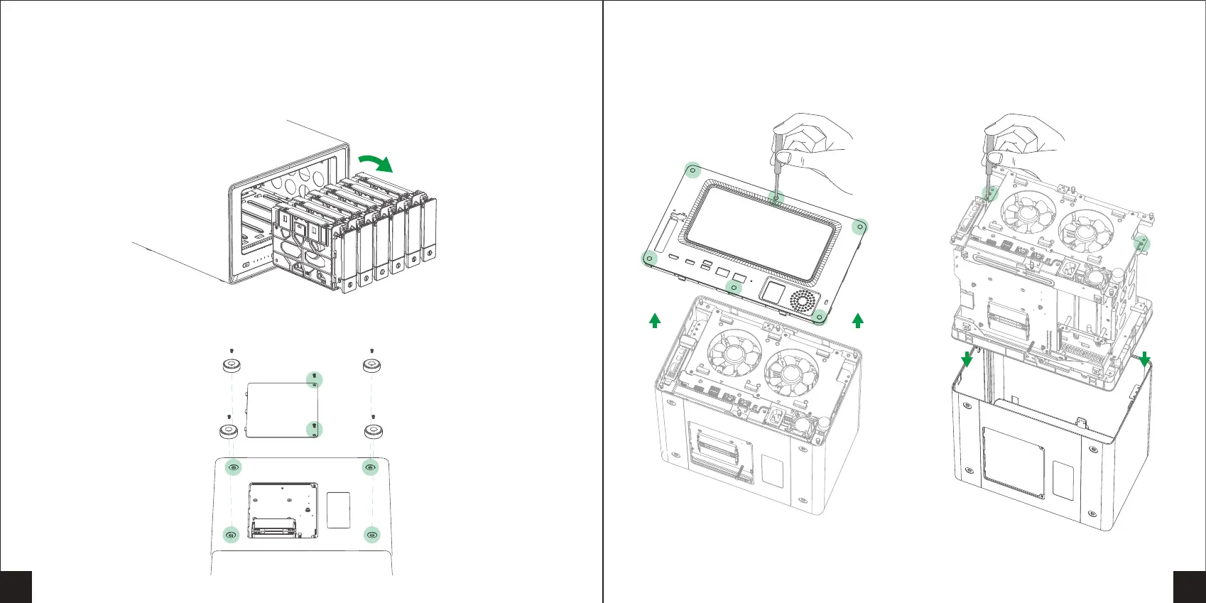 2. Drehen Sie das NAS-Gerät um, entfernen Sie die Schrauben und die Bodenplatte, lösen Sie dann die
