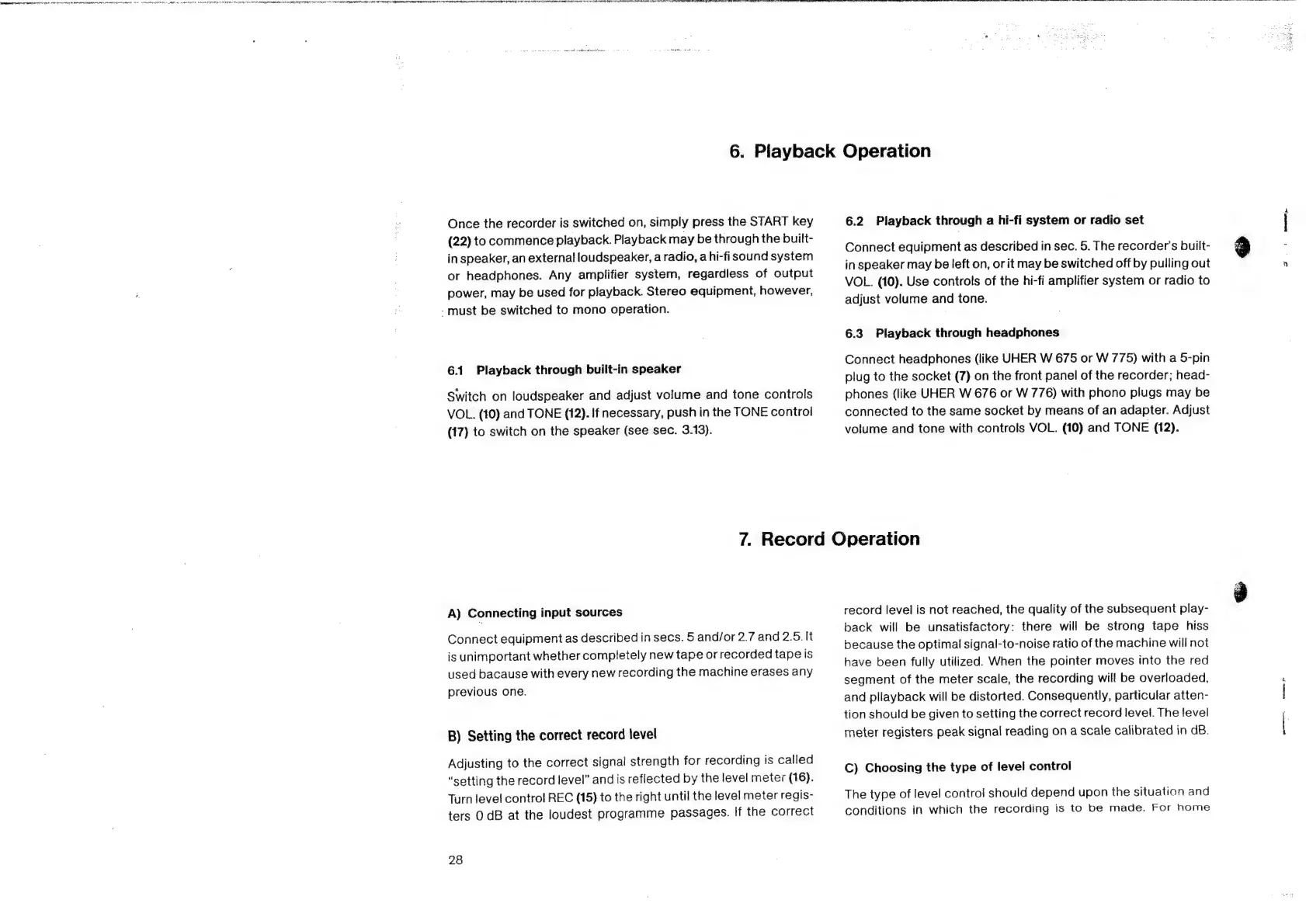 uher 6000 REPORT UNIVERSAL - Piayback Operation; Playback through Built-In Speaker; Playback through a Hi-Fi System or Radio Set; Playback through Headphones