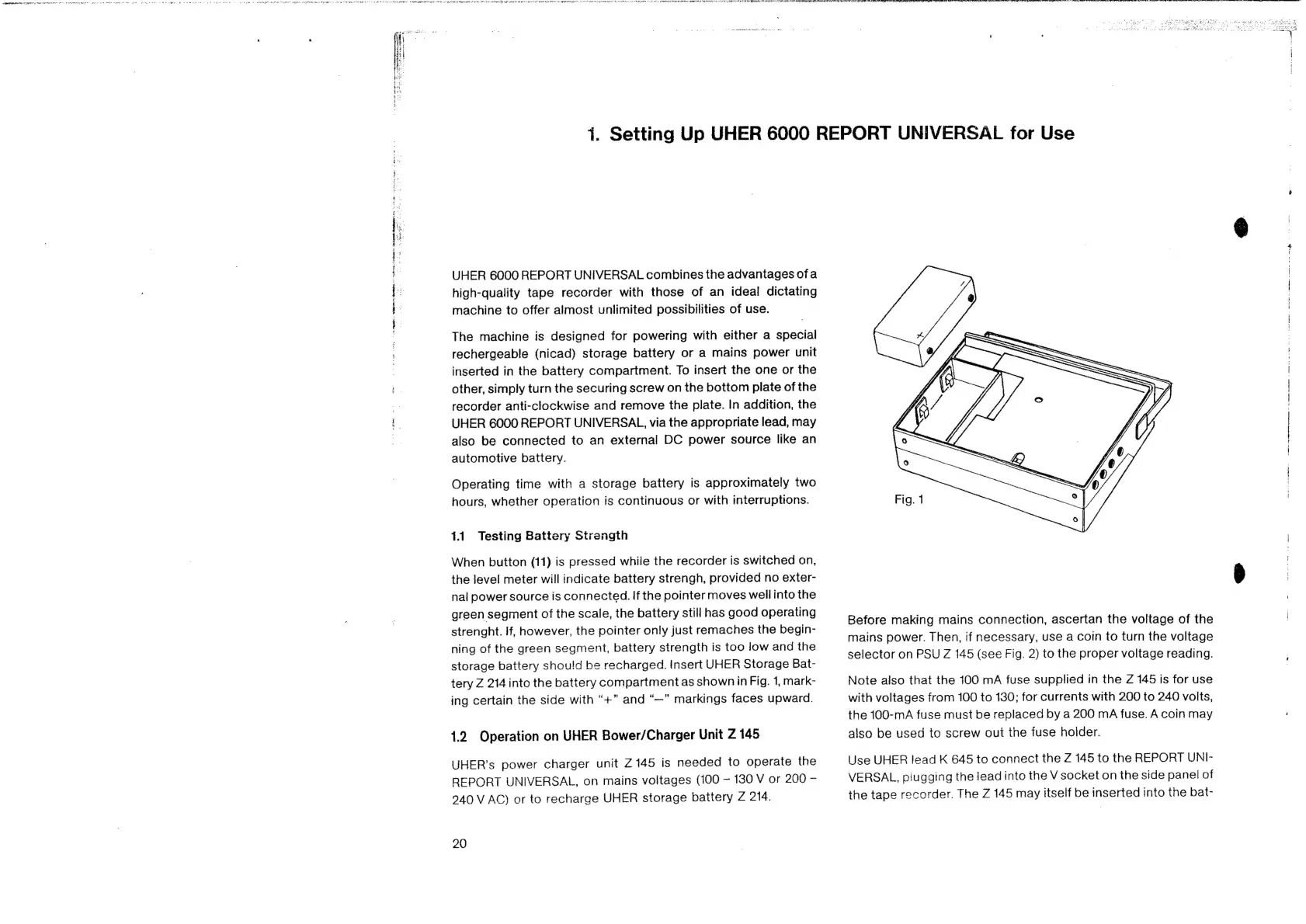 uher 6000 REPORT UNIVERSAL - Setting up UHER 6000 REPORT UNIVERSAL; Testing Battery Strength