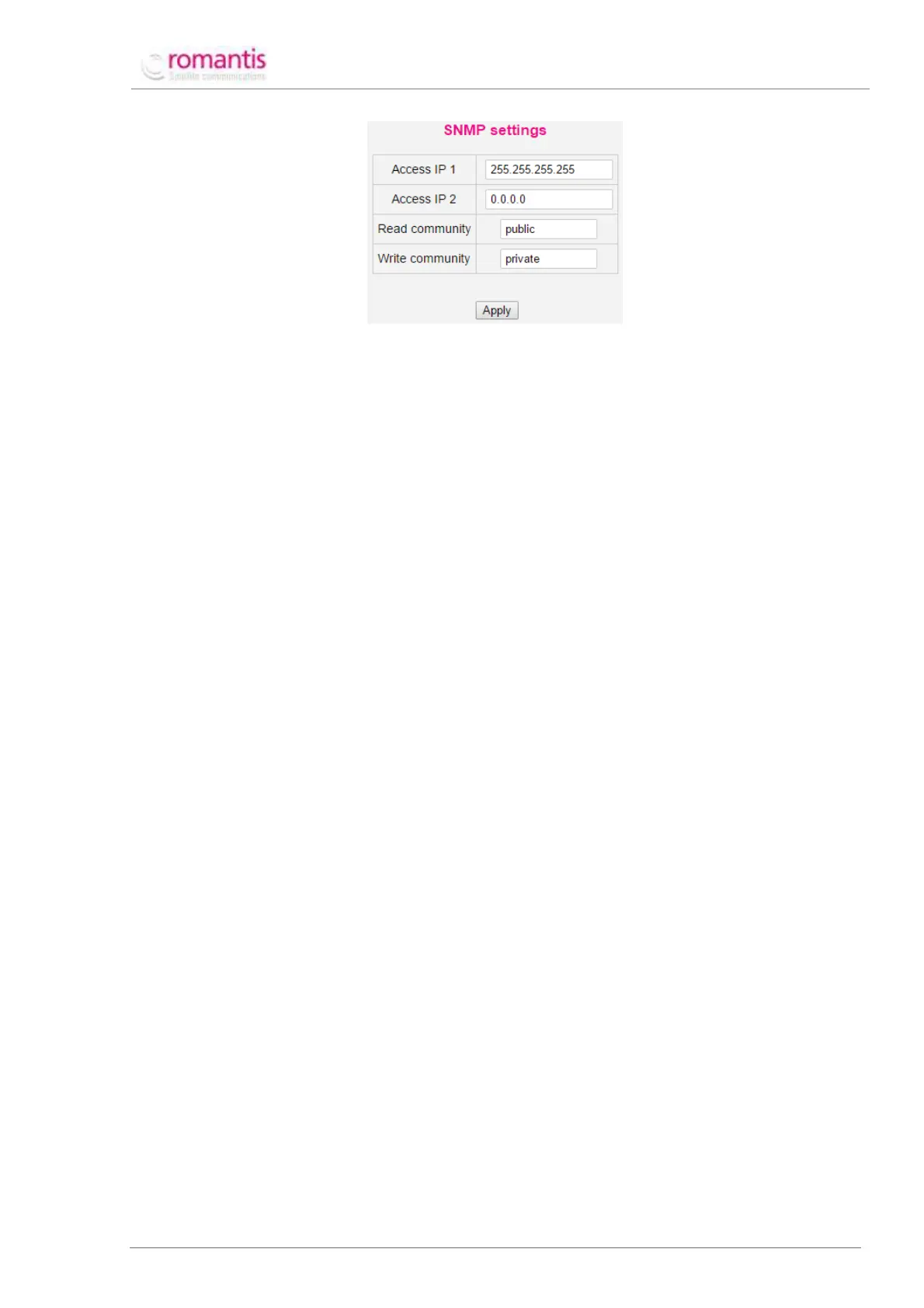 If parameter Access IP 1 is set to 255.255.255.255 value then UHP router is accessible by SNMP protocol from all